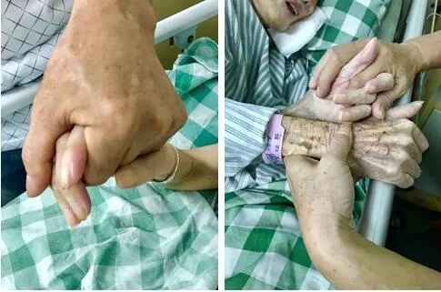 这两张图同时照于相邻的两张病床,左图丈夫紧握着妻子的手,她因乳腺癌晚期多处转移,在烧伤科治疗髂腰部到膝部的巨大脓肿溃疡。右图的老妈妈在烧伤科治疗骶尾部严重压疮,她的中年儿子一边帮她暖手一边细细叮咛着什么。两位病人因病情严重、病程漫长,瘫痪在床而不能自理。医生每天查房都能看到两位年过半百的男人为她们洗漱整理,打扮得整整齐齐干干净净,然后拉着至亲的手和声细语地说话。烧伤整形外科梁茶主任说这些场面总让她想到那句歌词:“我能想到最浪漫的事,就是和你一起慢慢变老……”唱得轻松,做起来却不容易,大概这份细心的照顾都源于隽永、深刻的爱。