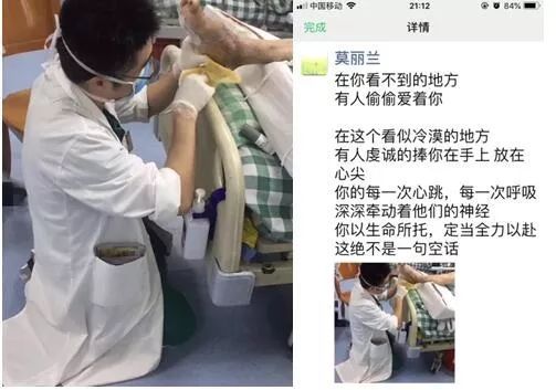 曹中良医生白天做了好几台手术,晚上11点继续跑到呼吸内科重症监护病房(RICU)为患者会诊。为了方便卧床的病人,减轻其抬腿的不便和痛苦,他索性跪下来给病人换药,换完药脚都是麻的。当时呼吸科护士长莫丽兰正在隔壁床护理病人,偶然看见这一幕就随手拍了下来。她感慨道,在RICU这样封闭的病房,医生为了病人这么拼,病人不知道,家属也不知道,医生这样做纯粹出于本心。“其实,在医院这样看似冷漠的地方,还有很多人偷偷爱着你。”在疾病面前,这种关乎生命的爱意更显得宽广博大。