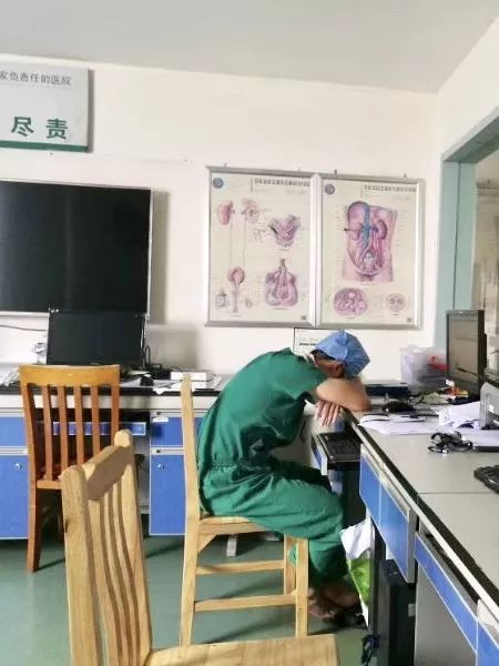 烧伤科多是急诊病人,医生几乎365天不管什么时候都随叫随到。上图曹医生,白天上午手术,下午为病人换药,晚上还收治了一个急诊大面积烧伤病人,处理完已是半夜三更,写完病历已经累得趴在桌子上睡着了……