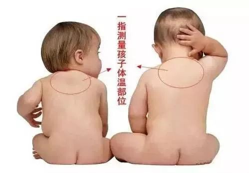 将手伸入宝宝的后衣领,摸一摸后颈和上背心处(如下图),左右横扫一下。