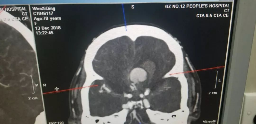 在多科医生、护士的严密监护下,完成了CTA检查,果然发现胼周动脉瘤。