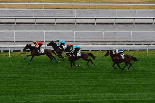 ▲五匹赛驹在纯演示性速度马术比赛的首试闸中冲过终点。