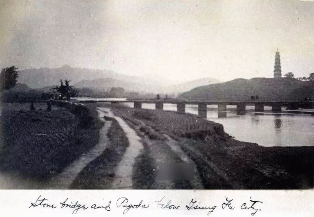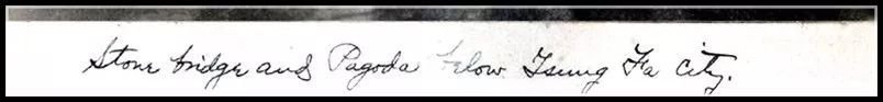 仔细端详照片,可以看见下方有这么一些字迹潦草的英语:Stone bridge and Pagode below Tsung Fa City