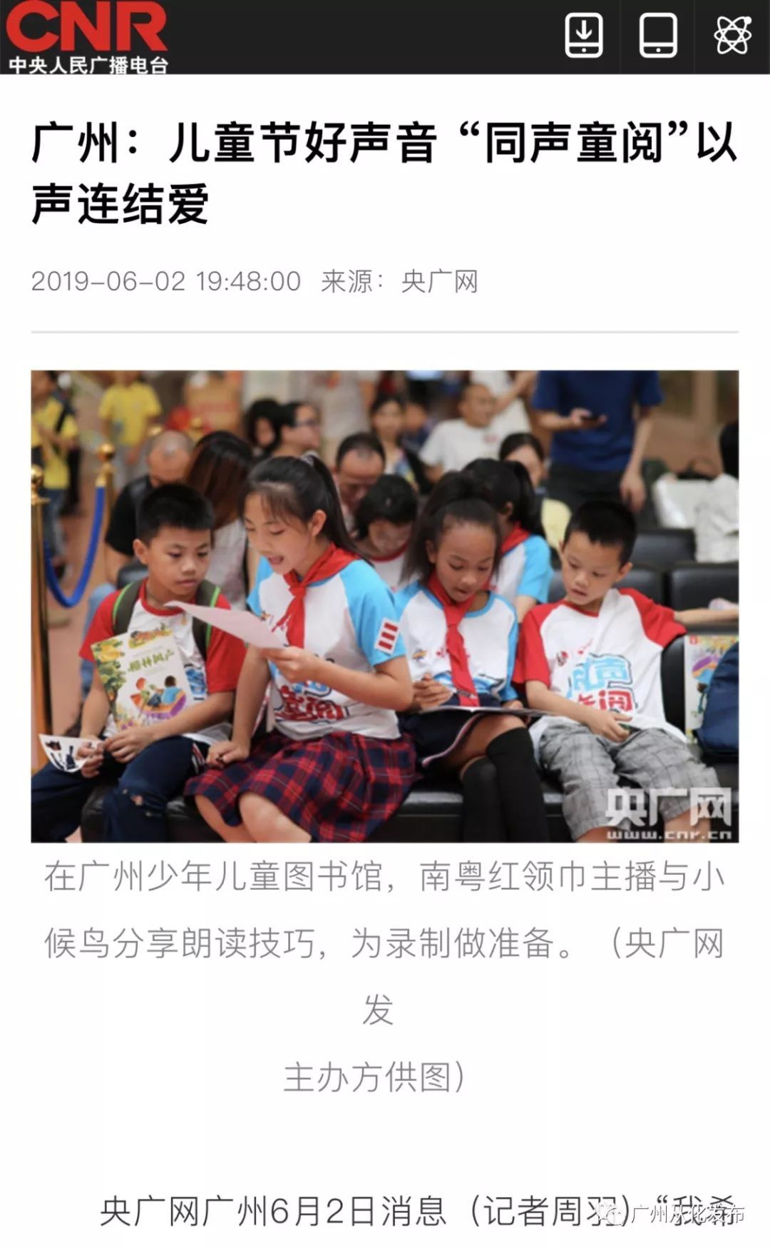 在6月2日儿童节期间,“同声童阅”再次启动。来自广东广播电视台嘉佳卡通卫视主持人、南粤红领巾主播大赛专业级评委龙虾哥哥,现场向孩子们分享了朗读的技巧。此后,8位从全省万余所中小学选拔的南粤红领巾主播成为“小老师”,与广州流动儿童“小候鸟”击掌为友,结成对子,带领他们走进朗读的世界,体验了一次精彩的有声阅读之旅。