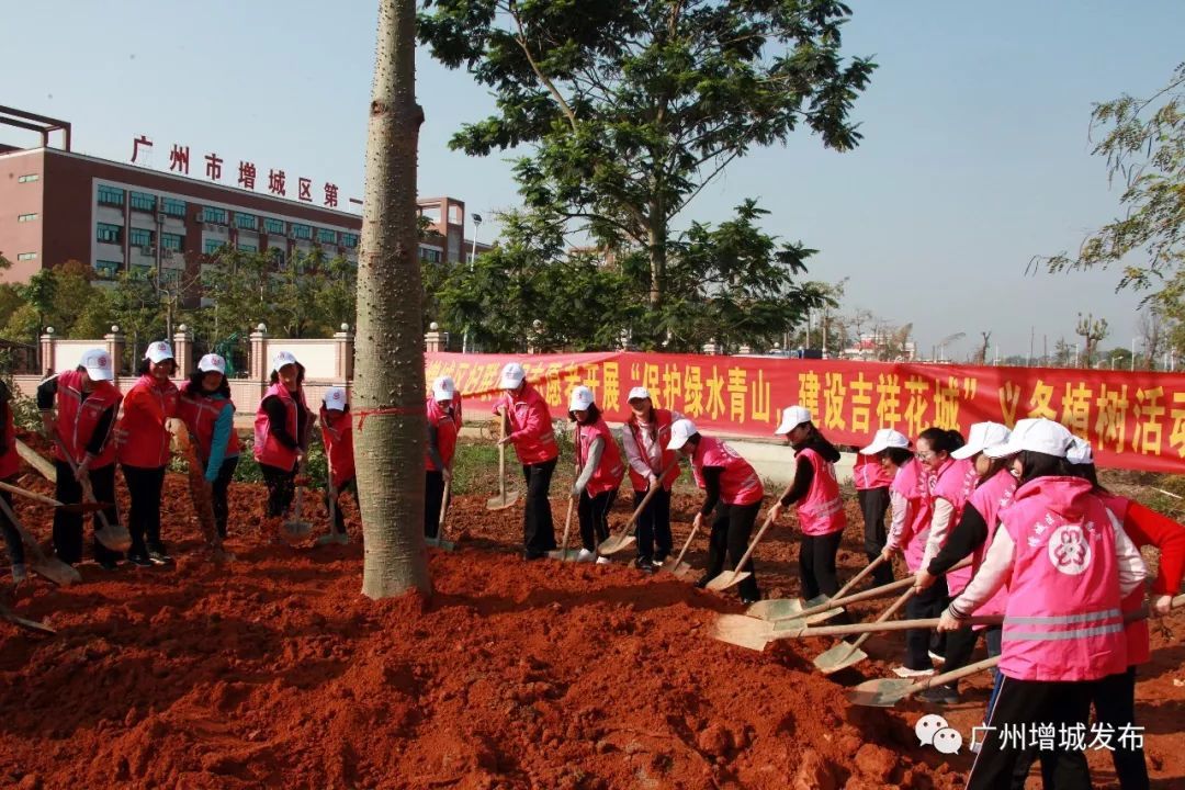 植树活动现场,区领导与来自区财政局、区林业和园林局、团区委、区妇联、国家统计局增城调查队等单位的120多名干部职工穿戴水鞋,齐齐动手,紧张有序忙碌着。