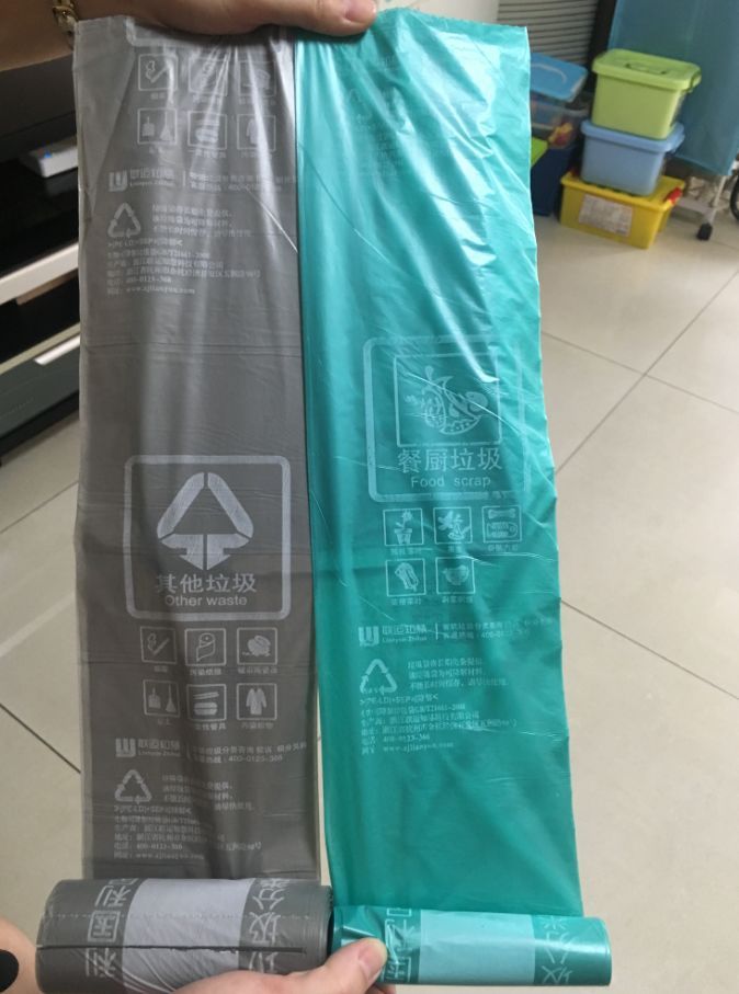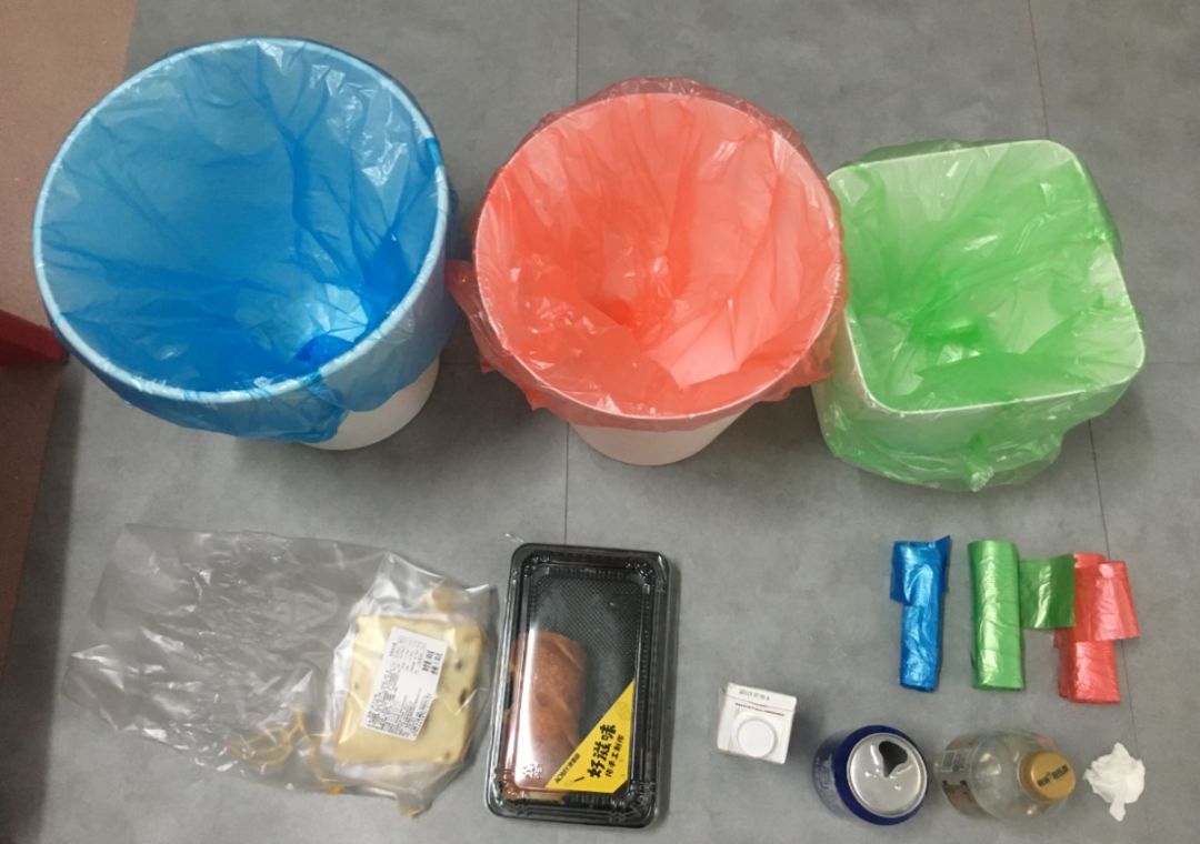 ❷涂女士在家里放置了三个垃圾桶,分别是生活垃圾桶、可回收垃圾桶和厨余垃圾桶,并套上了三种不同颜色的垃圾袋用于区分。