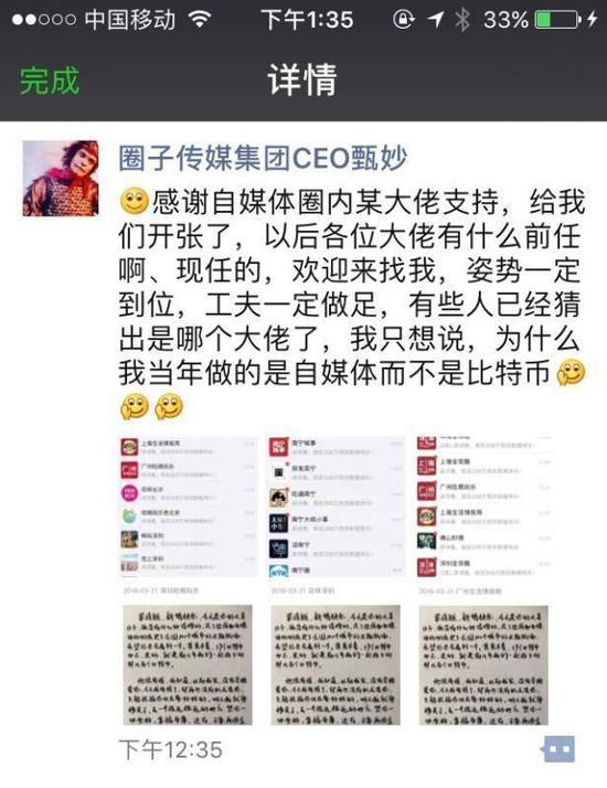 上午12点半,文章推送后不久,圈子传媒集团CEO甄妙更新了一条朋友圈:感谢自媒体圈内某大佬支持,给我们开张了,并附上发文的公众号和手写信截图。