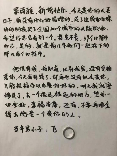 文章里仅包含了一张手写信的图片,一名自称是“飞”的男子表示自己花了208万买下了全国100个城市的头版版面,祝前女友梁诗雅新婚快乐。而这208万头条,花了39个比特币。这,正是前几年两人一起存下的几百个比特币。