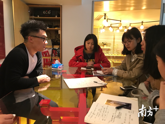 3月22日,广州东山口的扉美术馆里,何志森在给学生上一门叫“美术馆的菜市场”的课。他穿着一身黑衣,安静地坐在角落,听学生讲述有关菜市场的设计想法。如果不是那一头标志性的三角形发型,没人知道他是那个前些天一夜爆红的“粉红”建筑设计师。