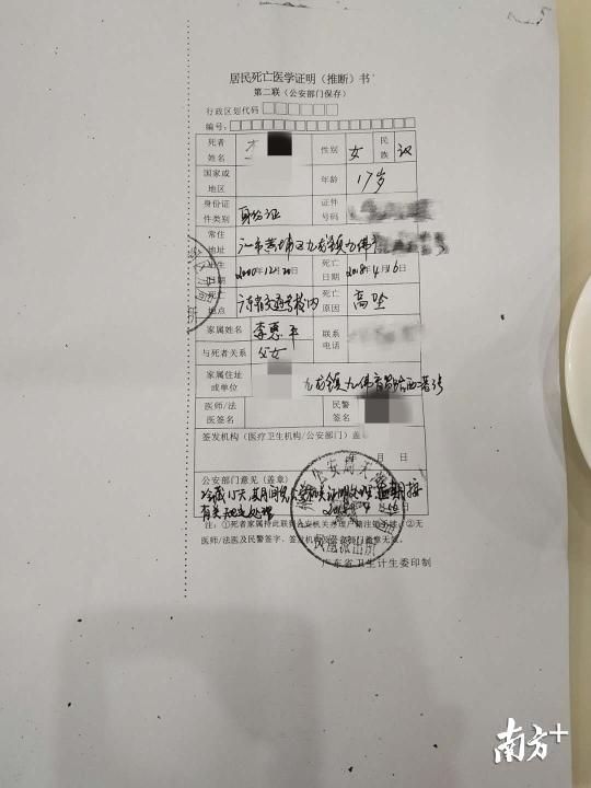 记者留意到,在当天的居民死亡医学证明(推断)书显示,死亡原因为“高坠”。