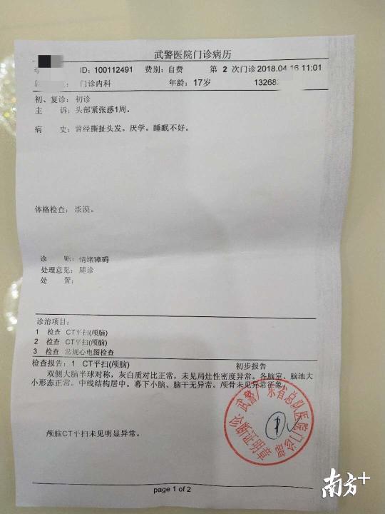 从家属提供的病历来看,诊断结果为“情绪障碍”。体检结束后,小芸回到了学校。10点40多分,李惠平赶回黄埔区九龙镇开店。12点20分左右,悲剧发生,小芸从教学楼6楼坠下。