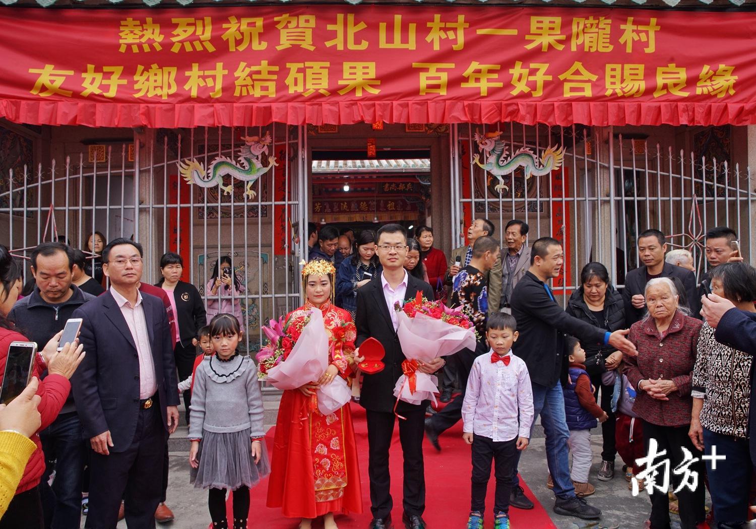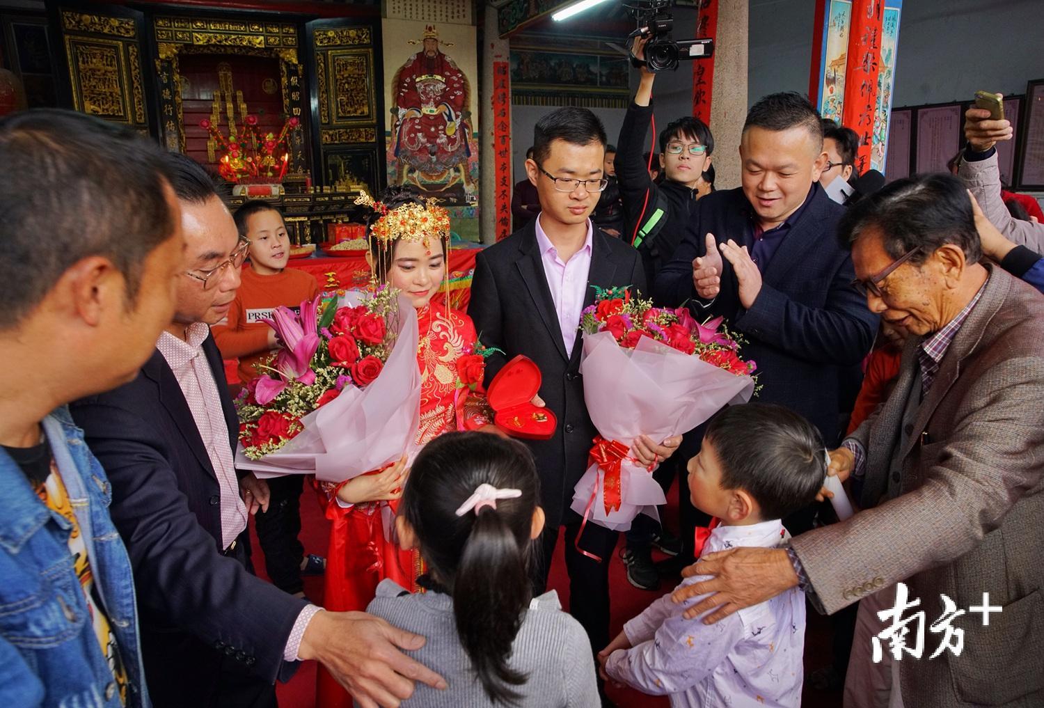 昭德祠里,挤满了前来祝贺的村民,他们不断用掌声、欢呼声表达对两位新人的祝福。“不容易啊,两村两百多年来,终于有了第一对公开的新人了。”村民许秋标难抑心中兴奋。