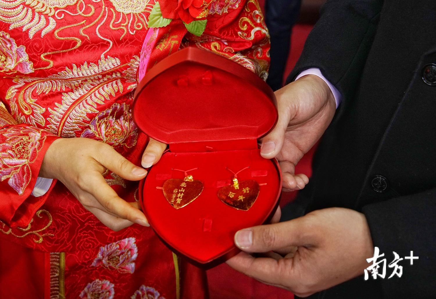 这段爱情更是得到了两村人的祝福。祭拜祖先后,北山村委会的负责人向两位新人送上了“桃形”金牌,寓意着“百年好合”。