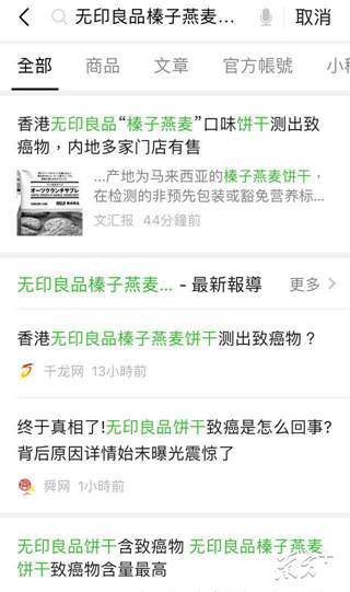 记者在微信上搜索“无印良品榛子燕麦饼干”字样,只有与饼干致癌信息相关的新闻报道。
