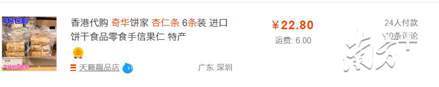 记者在淘宝的“奇华礼饼专家”旗舰店内,并无搜到杏仁条在售。但于淘宝搜索,有零散的淘宝店主在售有问题的六条装杏仁条,月销售量最高的一家店销售量为24。