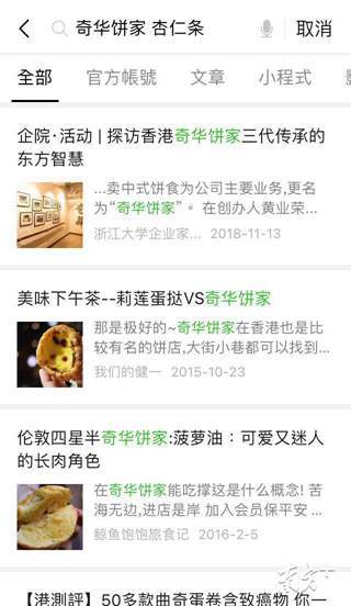 记者在微信搜索“奇华饼家 杏仁条”字样,前三条都是奇华饼家的正面信息,到第四条,才出现香港测评51款曲奇蛋卷内含致癌物的新闻。