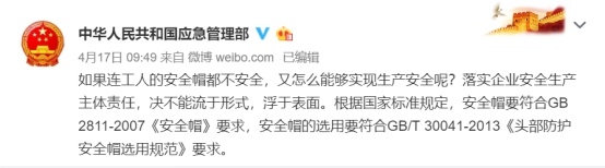 对此,应急管理部4月17日在官方微博回应称:“如果连工人的安全帽都不安全,又怎么能够实现生产安全呢?落实企业安全生产主体责任,决不能流于形式,浮于表面。根据国家标准规定,安全帽要符合GB 2811-2007《安全帽》要求,安全帽的选用要符合GB/T 30041-2013《头部防护 安全帽选用规范》要求。”