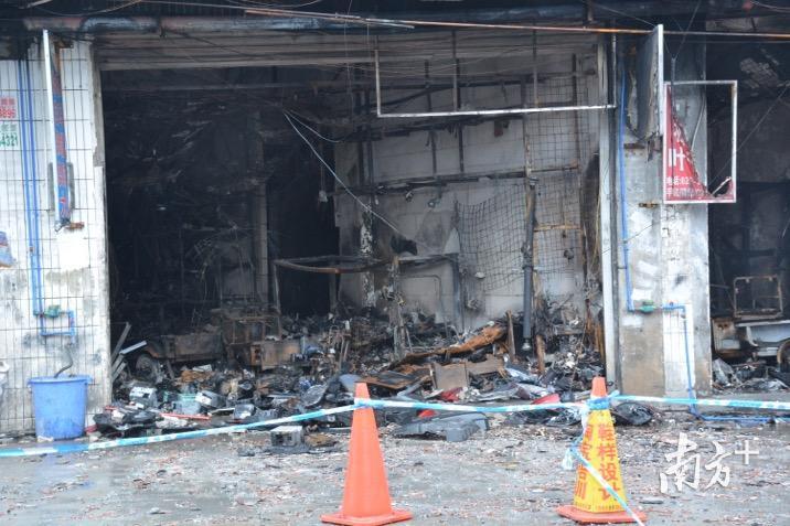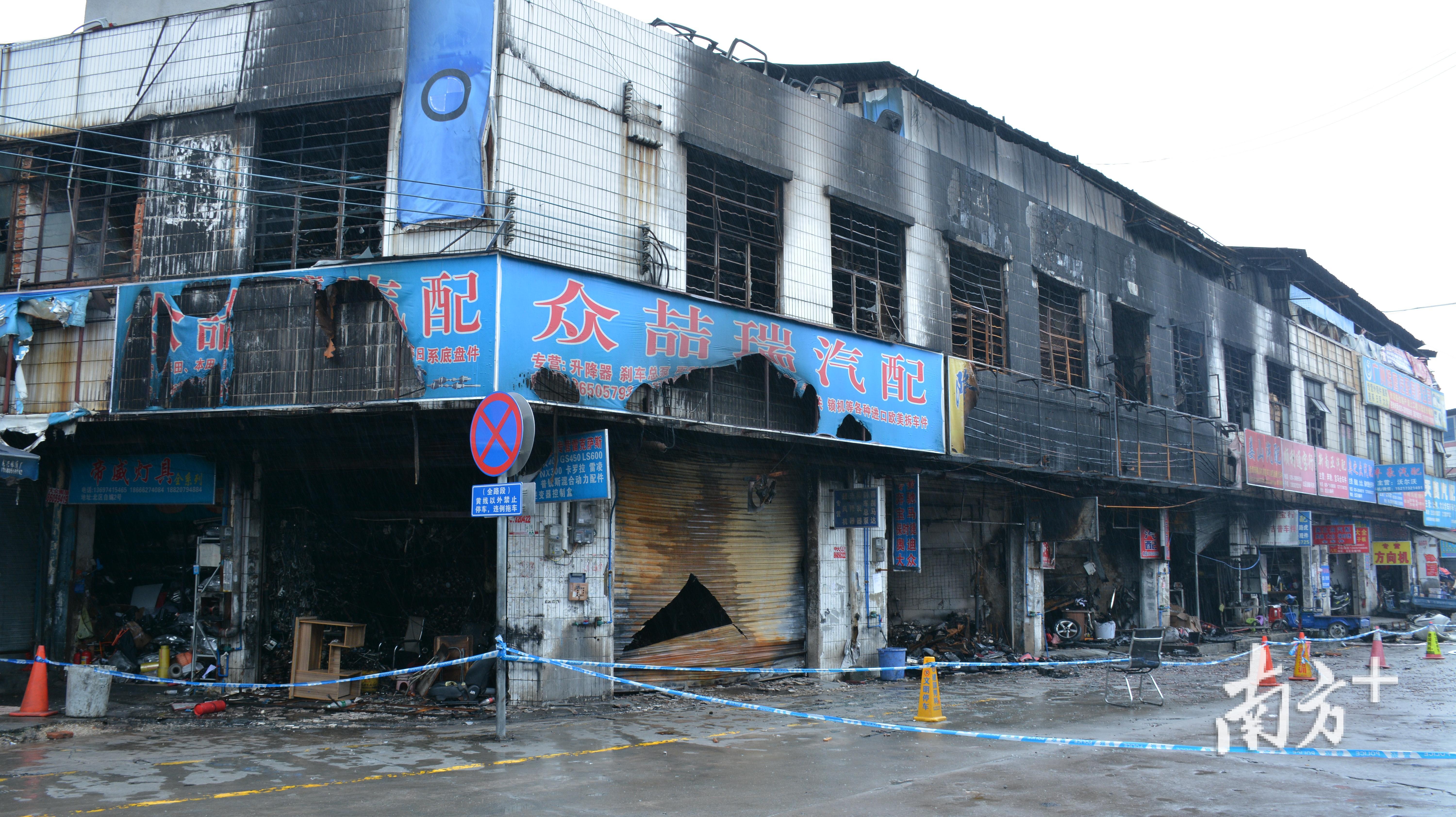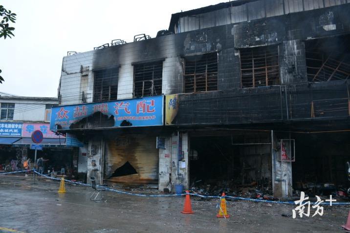 上午10时,记者在现场看到,福庆街上已拉起警戒线,多家店铺墙体被熏黑,窗户玻璃破碎,店内被烧黑的物品散落一地,场面一片狼藉。