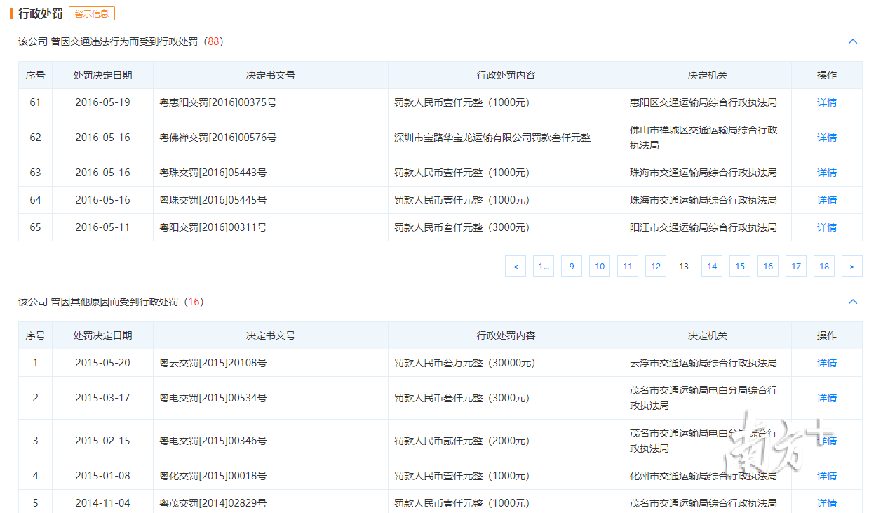 记者梳理发现,深圳、佛山、东莞、珠海、中山、江门、湛江、阳江、梅州、茂名、云浮等地市的交通执法部门都处罚过深圳市宝路华宝龙运输有限公司。公司的违规行为几乎遍布全省。