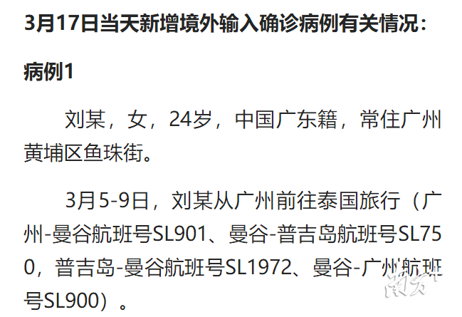 “广州女毒王”所指向的是于3月17日确诊的刘某。广州市卫健委通报了刘某的相关情况和活动轨迹:刘某,女,24岁,中国广东籍,常住广州黄埔区鱼珠街。3月5-9日,刘某从广州前往泰国旅行(广州-曼谷航班号SL901、曼谷-普吉岛航班号SL750,普吉岛-曼谷航班号SL1972、曼谷-广州航班号SL900)。