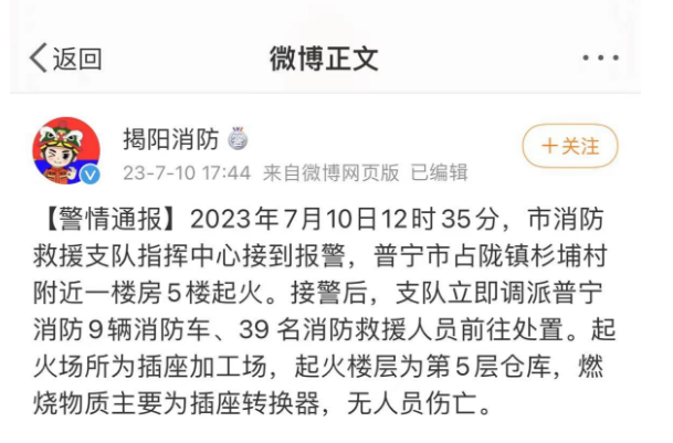 官方微博“揭阳消防”发布通报称,2023年7月10日12时35分,市消防救援支队指挥中心接到报警,普宁市占陇镇杉埔村附近一楼房5楼起火。接警后,支队立即调派普宁消防9辆消防车、39名消防救援人员前往处置。起火场所为插座加工场,起火楼层为第5层仓库,燃烧物质主要为插座转换器,无人员伤亡。