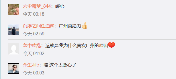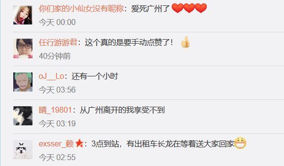 昨晚,公交集团“无论多晚,我们为您守候”保障措施落实后,相关信息推送至省市新闻媒体,其中“南站高铁晚点,广州公交兜底保障”的消息在新浪微博等发布后,阅读量接近30万,过百名旅客网友纷纷留言为集团“无论多晚,我们为您守候”的服务措施点赞:网友“余生-life”:“哇 这个太暖心了”,网友“沉浮之间任逍遥”:“广州真给力”,网友“你们家的小仙女没有昵称”:“爱死广州了”,网友“exsser_赖”:“3点到站,有出租车长龙在等着送大家回家”……