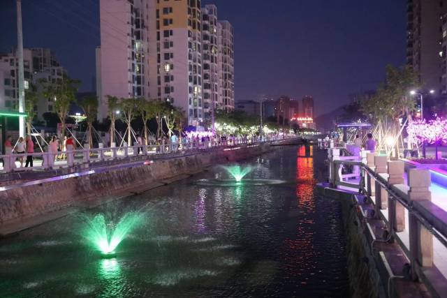 颇具古典韵味的花岗岩石材栏杆、木结构的景观廊桥、淡灰色瓦顶的风雨亭尽显岭南风格。种满簕杜鹃的花箱被挂放在岸堤上,倒映在水中;河道中间,景观喷泉不断地喷洒,发出淅淅沥沥的声音。夜幕降临,一河两岸的景观树上,霓虹灯亮了起来,又是另一片火树银花的绚丽景象。