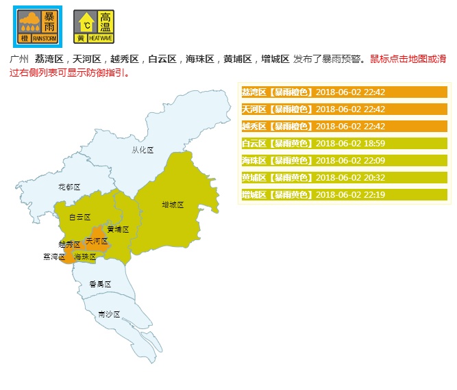 刚刚,广州市荔湾区、天河区、越秀区暴雨预警从黄色升级为橙色预警!白云区、海珠区、黄埔区、增城区暴雨黄色预警持续生效中!