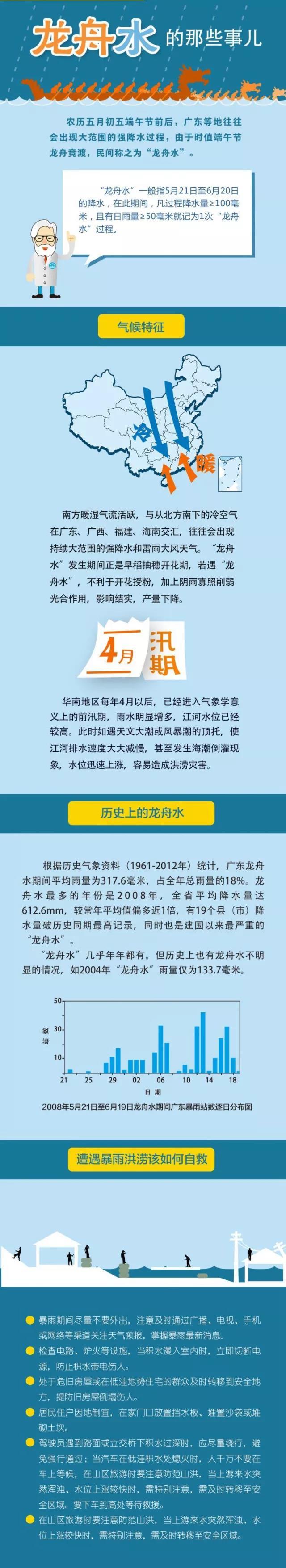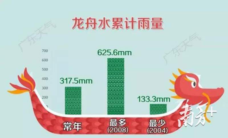民间把农历五月初五端午节前后的较大降水过程称为“龙舟水”。端午时节,南方暖湿气活跃,与从北方南下的冷空气交汇,形成持续大范围的强降水。气象上,一般将5月21日至6月20日的降水称为龙舟水。这时期的降水,也是华南前汛期降水的鼎盛时期。