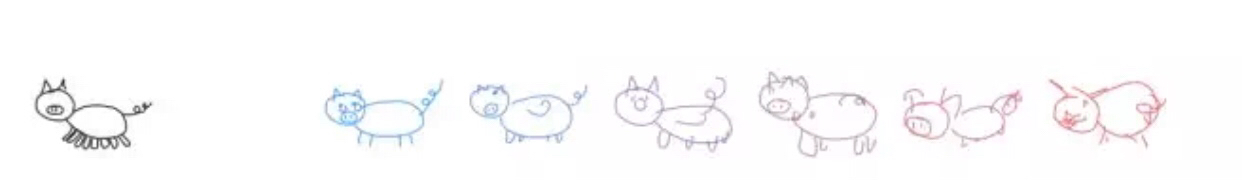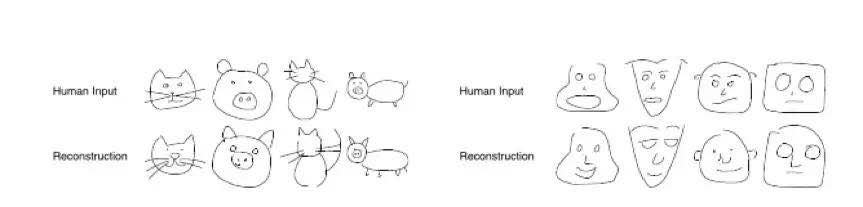人类涂鸦数据集中不光有静态的线条,也包括人们在绘制涂鸦时何时起笔、走笔方向、何时停笔等动态数据。这些数据组成的神经网络模型可以使AI接收到新涂鸦时生成一张类似的新涂鸦来进行识别。
