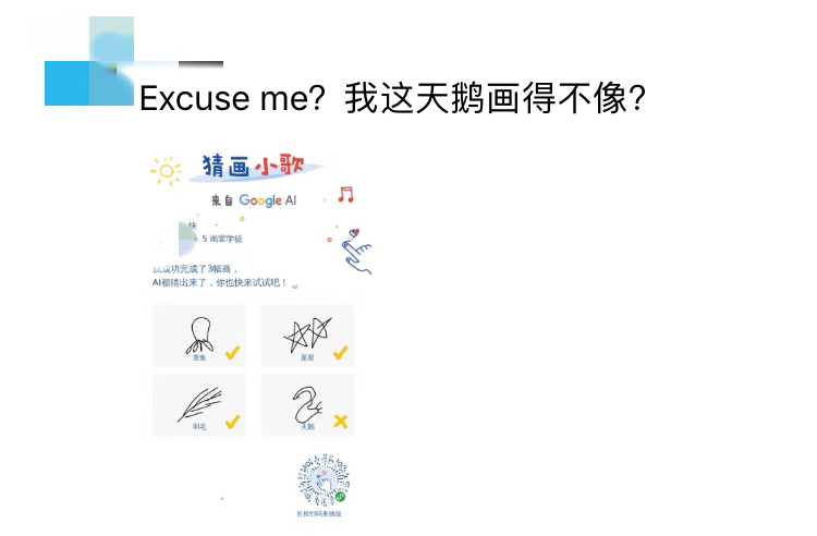 然而,如果不是乱写乱画或没有画完,一般情况下ai小歌不但能轻易猜出你的画,偶尔还能在你还没画完就猜出来,业务能力极强。