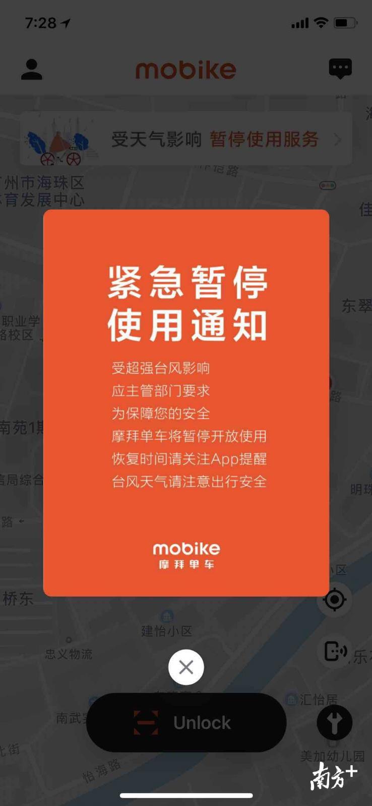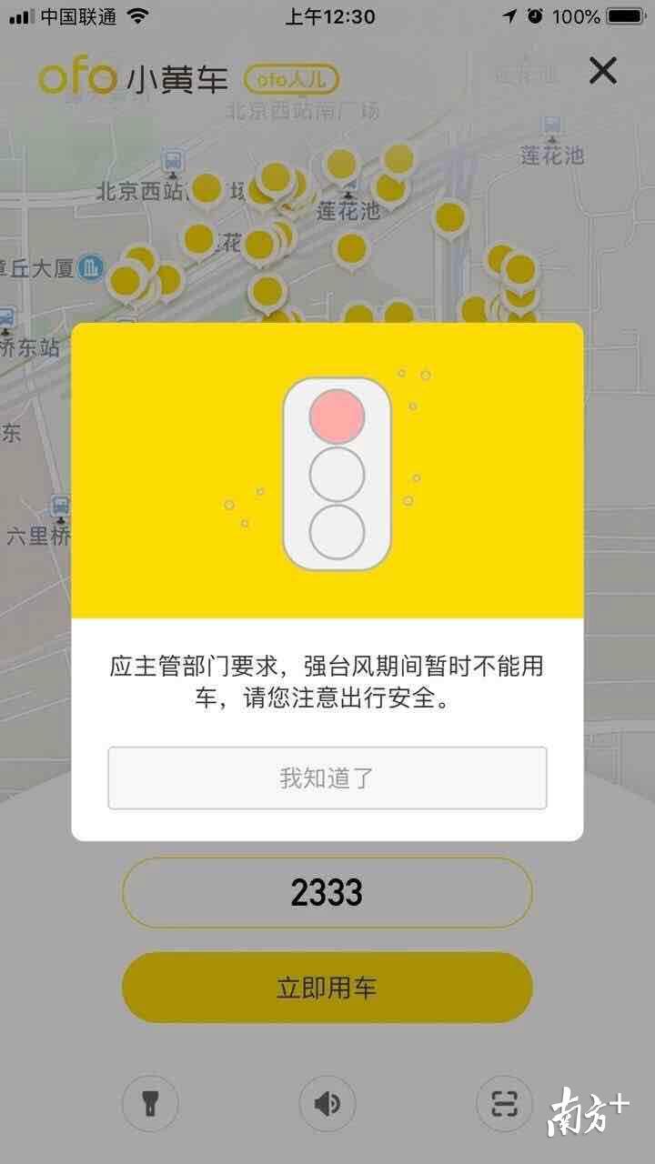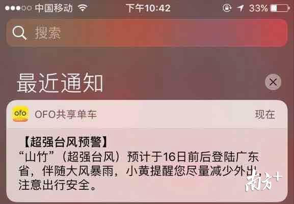 ofo方面,也暂停了广深两地的服务。据悉,15日晚间,ofo率先暂停了深圳地区的运营服务;16日,ofo暂停了广州地区的运营服务。同时,ofo在APP、微博等发布通知,待台风预警结束后再开始运营。ofo的APP端还对广东地区用户做了提醒推送,提示用户注意安全,规范停放车辆。