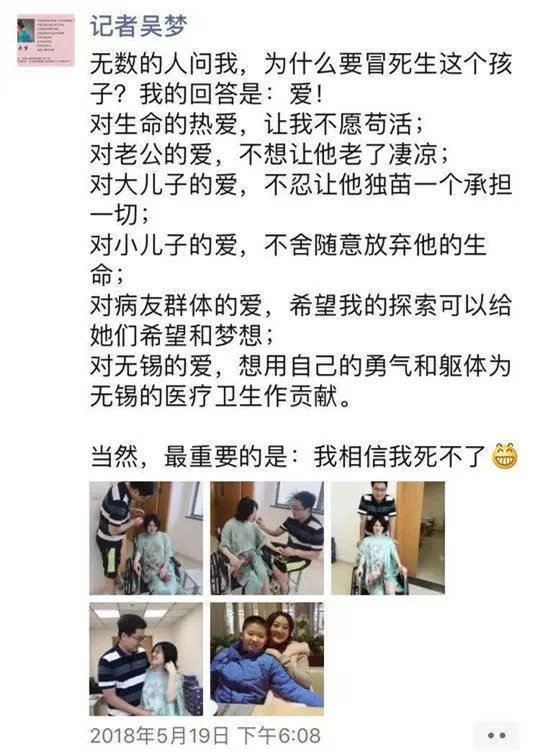 吴梦曾经在朋友圈发过一段话,“无数的人问我,为什么要冒死生这个孩子?我的回答是,爱!对于生命的热爱,让我不愿苟活;对老公的爱,不想让他老了凄凉;对大儿子的爱,不忍让他独苗一个承担一切;对小儿子的爱,不忍随意放弃他的生命……”