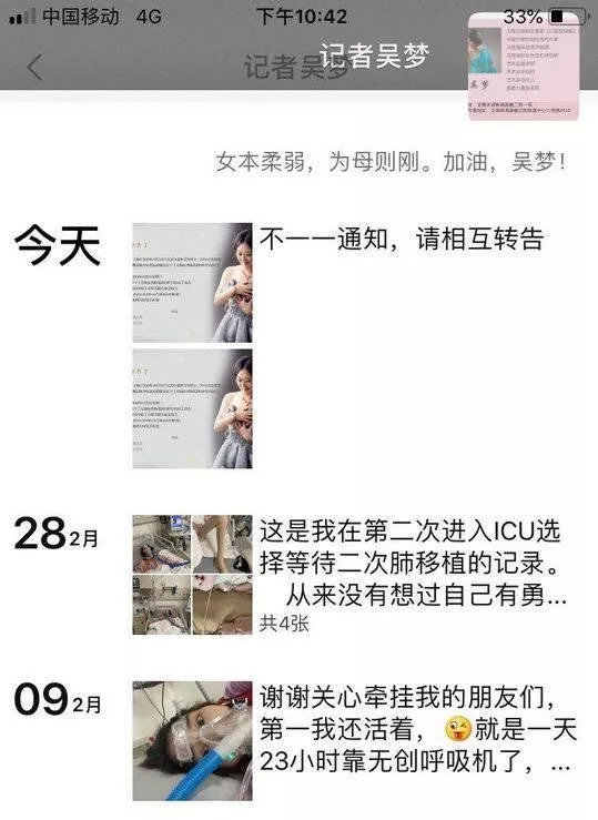 只不过人间太少奇迹,今年2月,吴梦的病情再一次恶化。2月28日,她第二次进入ICU,等待二次肺移植。但她的身体状况太糟糕了,已经无法接受手术,在与病魔搏斗了一个多月后,她告别了自己恋恋不舍的亲人和世界。