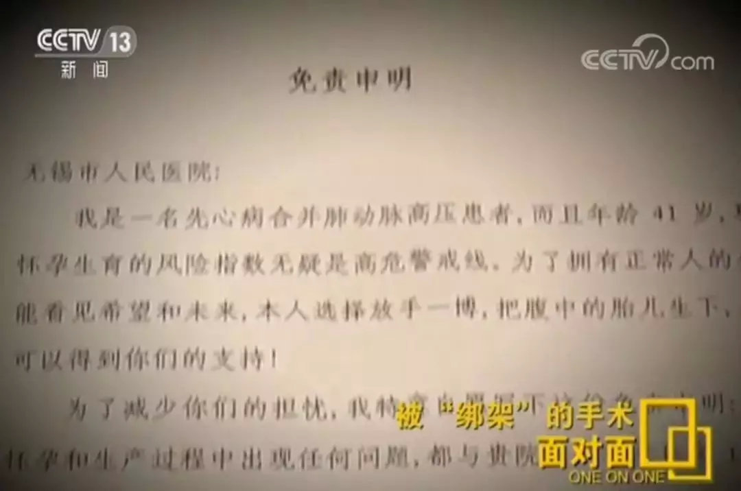 由于检查结果显示胎儿一切正常,吴梦拒绝了医生终止妊娠的建议,她希望能够怀孕直至分娩,为此她专门写了一份免责声明,承认自己了解一切可能的风险,自愿放手一搏,无论生死,都不会追究医生的一切责任。
