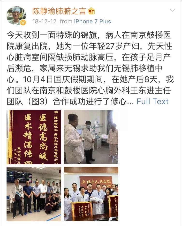 这位孕妇患有先天性心脏病室间隔缺损肺动脉高压,在孩子足月产后濒危,家属求助无锡肺移植中心。在她产后8天,陈静瑜团队在南京和鼓楼医院心胸外科王东进主任团队合作成功进行了修心换肺手术。