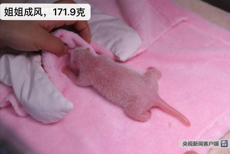 成都大熊猫繁育研究基地动管部主管、高级畜牧师 吴孔菊:第一个姐姐出来了,妈妈还是很平静的,而且吃东西也吃的很好,我们都以为它只有这一个胖娃娃了,但是后来18:00左右,就生了这个小宝宝。