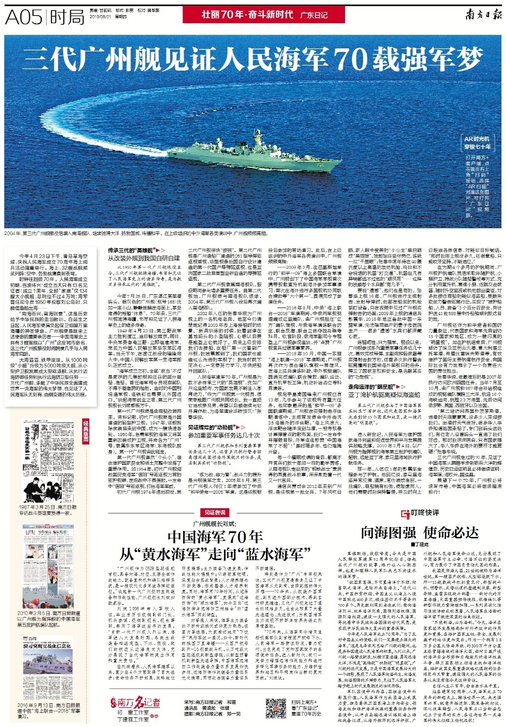 广州舰一路劈波斩浪,纵横万里海疆,勇闯远海大洋,是“英雄舰”“功勋舰”“明星舰”。同时,也是海军70年发展的一个缩影,见证了人民海军大踏步赶上时代发展潮流的壮阔历程。