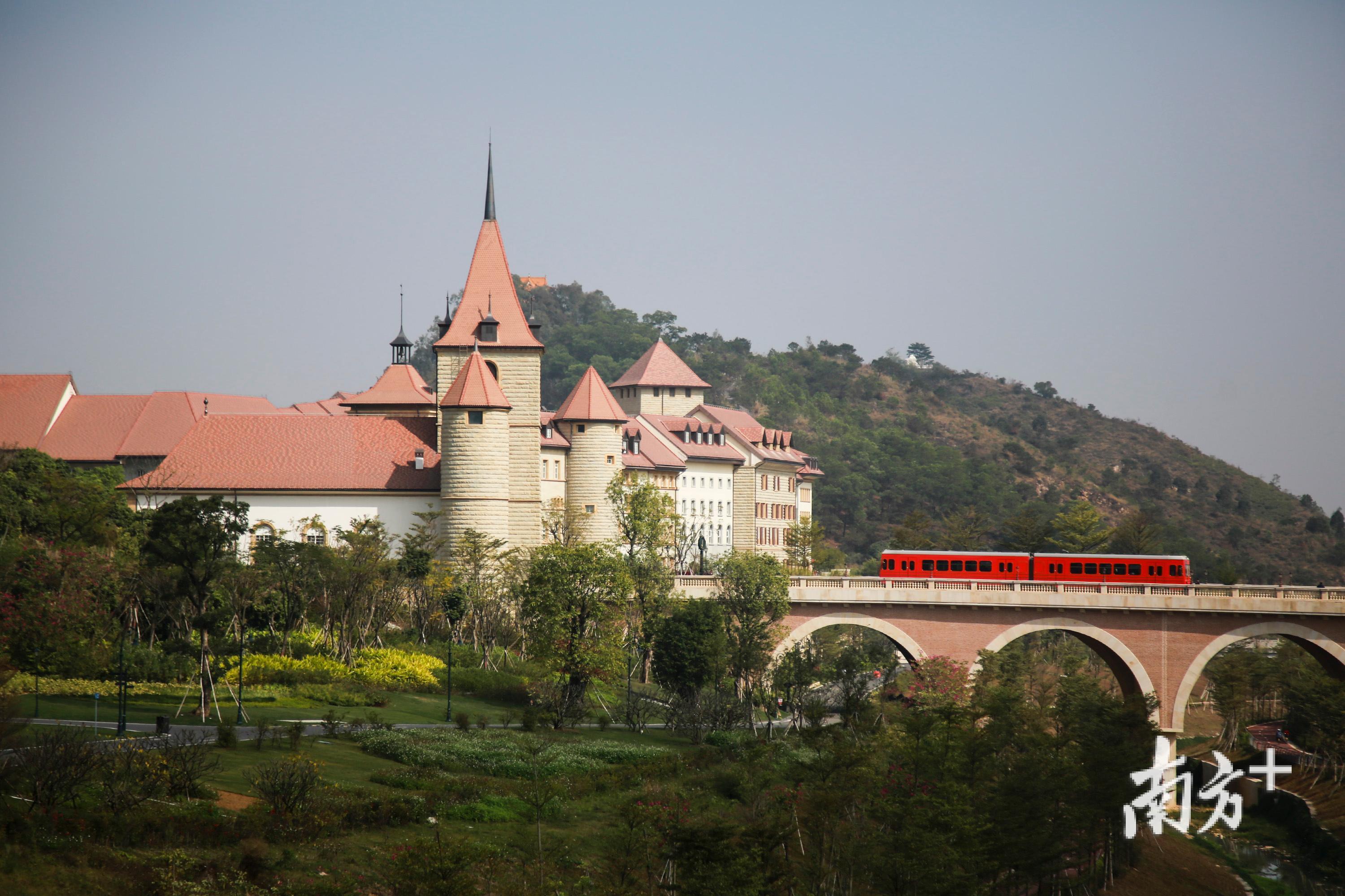在小火车站台上有中英双语指示牌,显示着乘客当前所在站和下列车的距离。小火车有专用的轻轨,从桥上、草地间不慌不忙地驶过,员工可坐火车去往目的地,每个小镇之间都设有一个火车站,小火车运行一圈下来约10分钟。