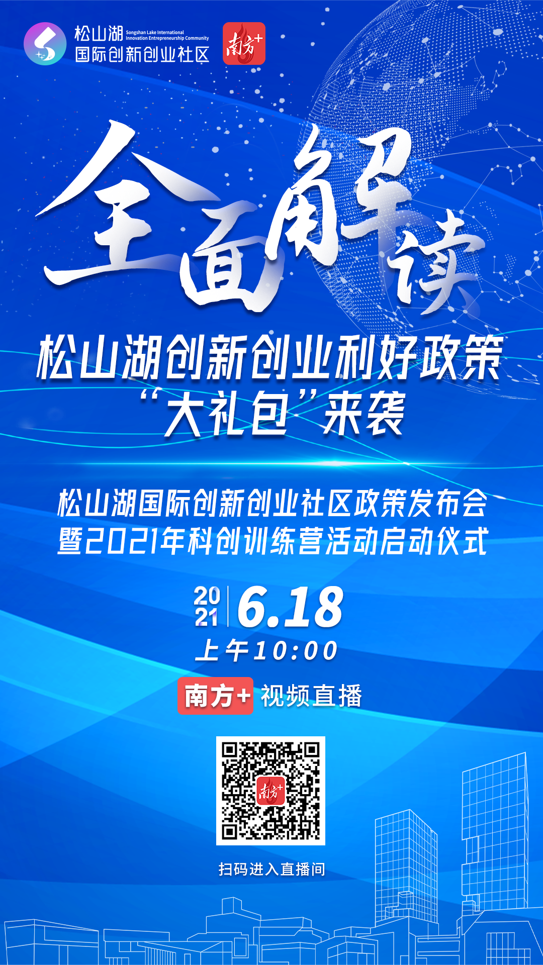 社区政策发布会及2021年科创训练营活动启动仪式将于明日(6月18日)上午10点开始,扫描下方二维码,一起来看松山湖创新创业利好政策“大礼包”的全面解读!