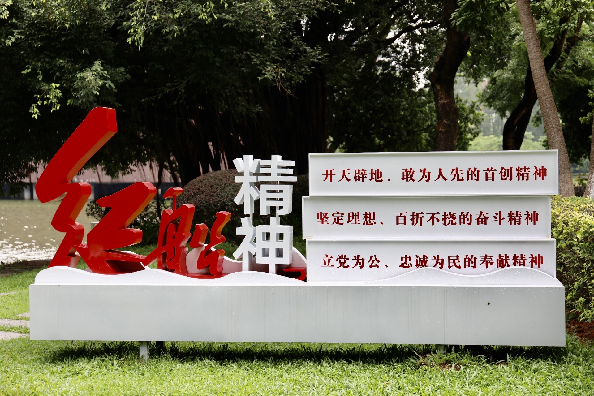 在图书馆、红棉路及环湖路等户外场所,关于创新、发展及未来的宣传标语与松山湖独特的山水元素有机结合,体现了园区紧跟时代命题,立足国家战略,不断谋求创新发展的决心与信心。同时,这些色彩鲜明、设计独特、清新自然的红色小景,也已成为市民喜闻乐见的“打卡点”。