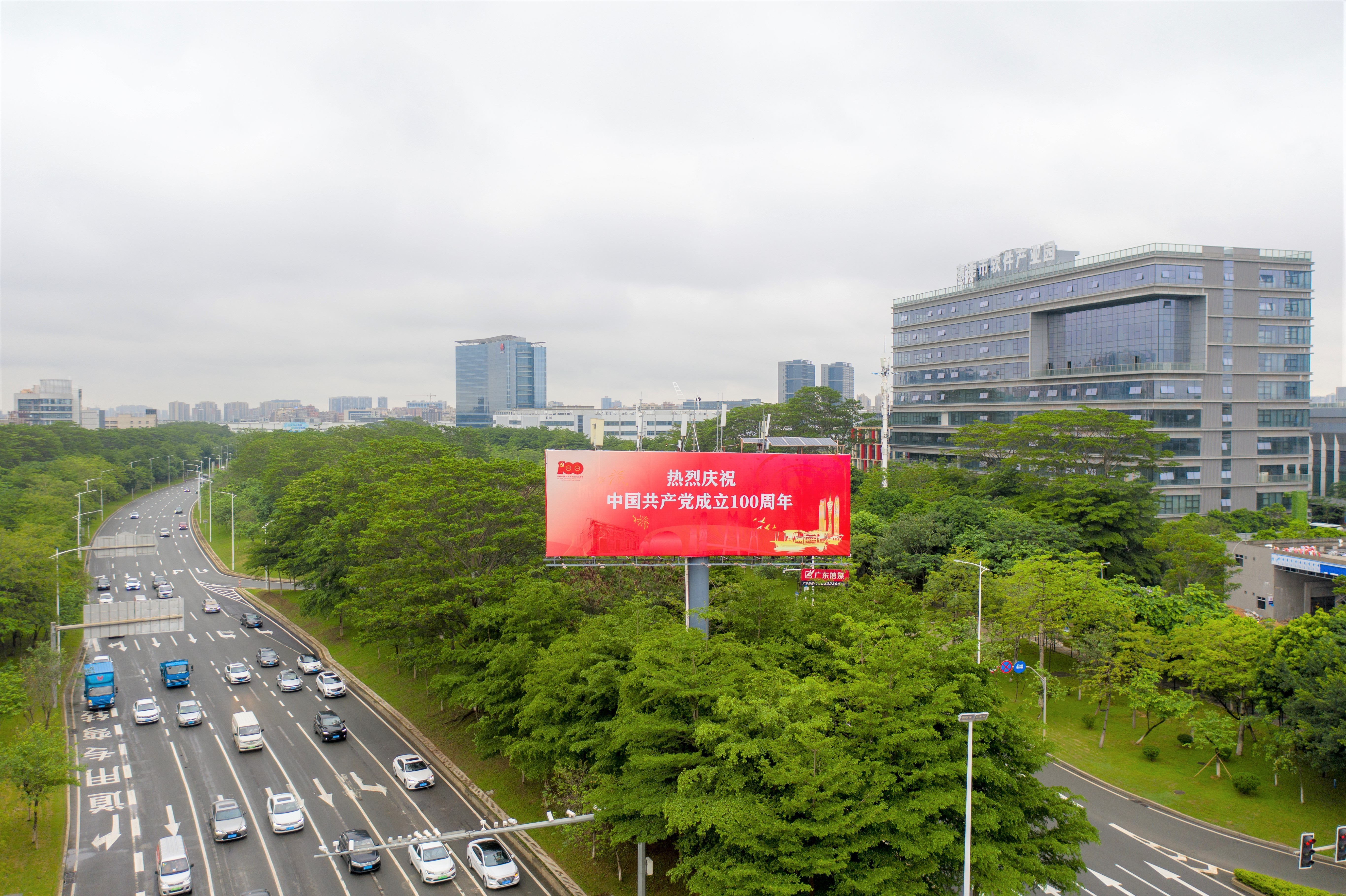 松山湖新城大道与工业南路交界处宣传语——“热烈庆祝中国共产党成立100周年”。