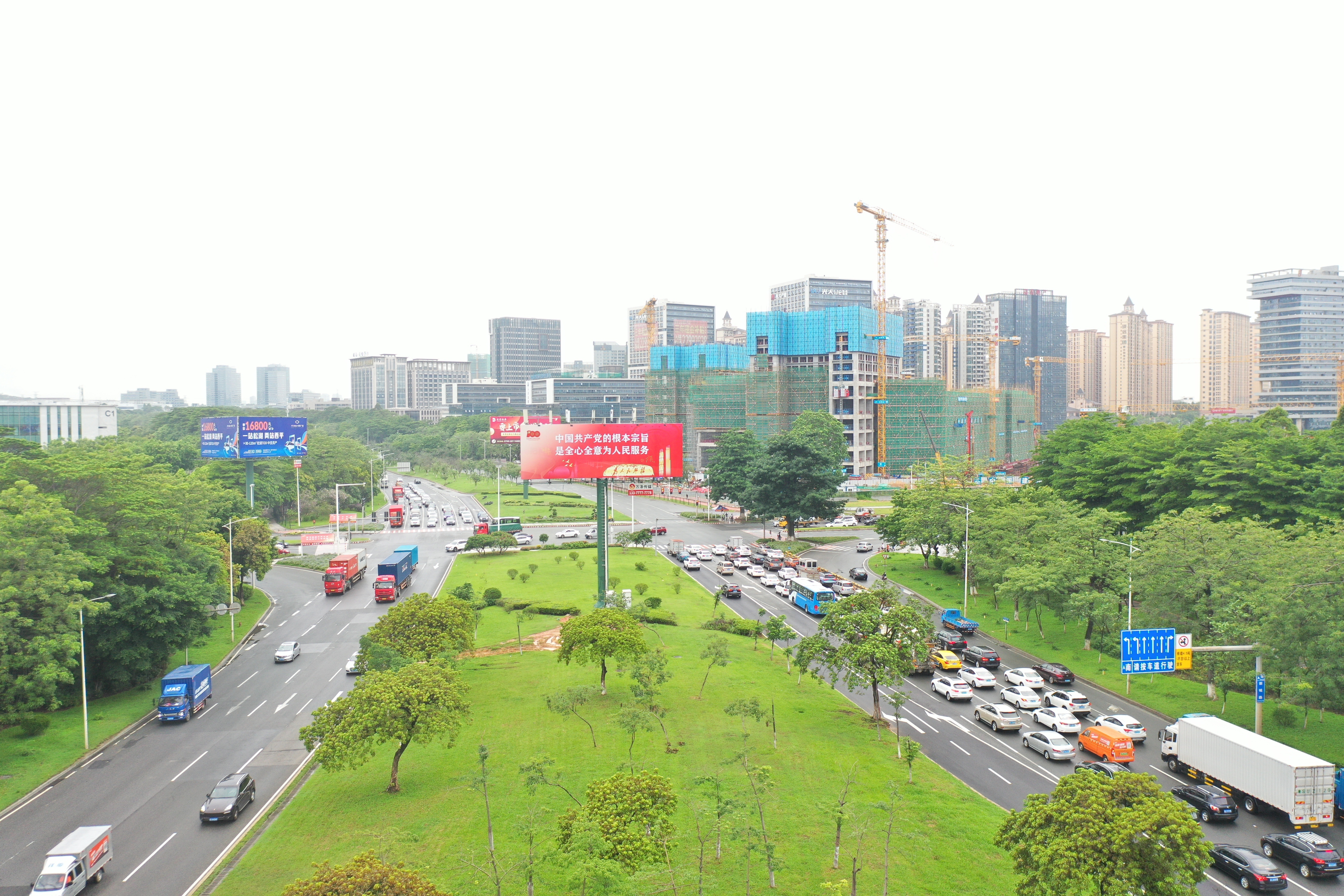 新城大道与迎宾路交界处宣传标语——“中国共产党的根本宗旨 是全心全意为人民服务”。