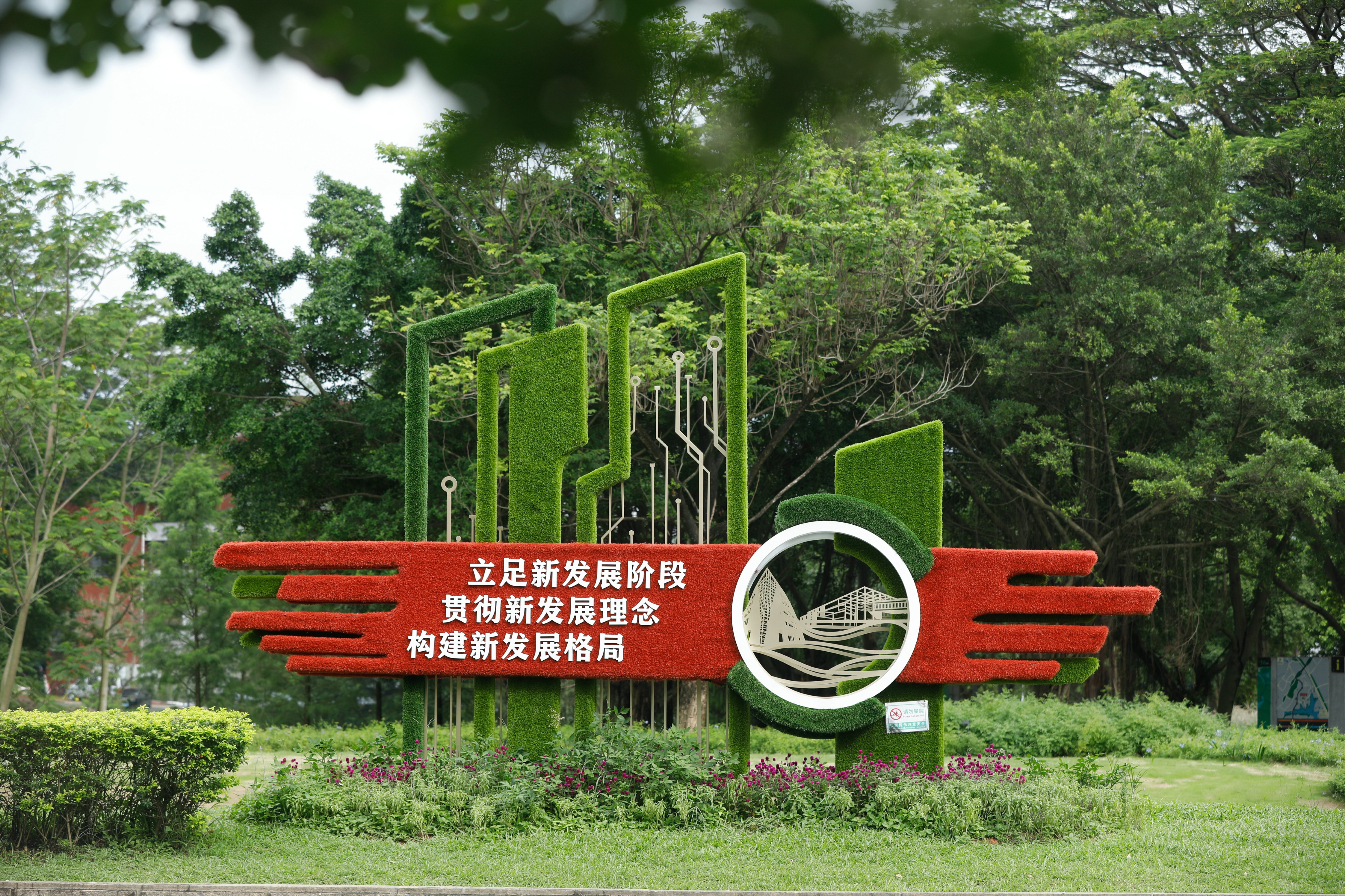 松山湖图书馆外展示宣传标语——“立足新发展阶段 贯彻新发展理念 构建新发展格局”。