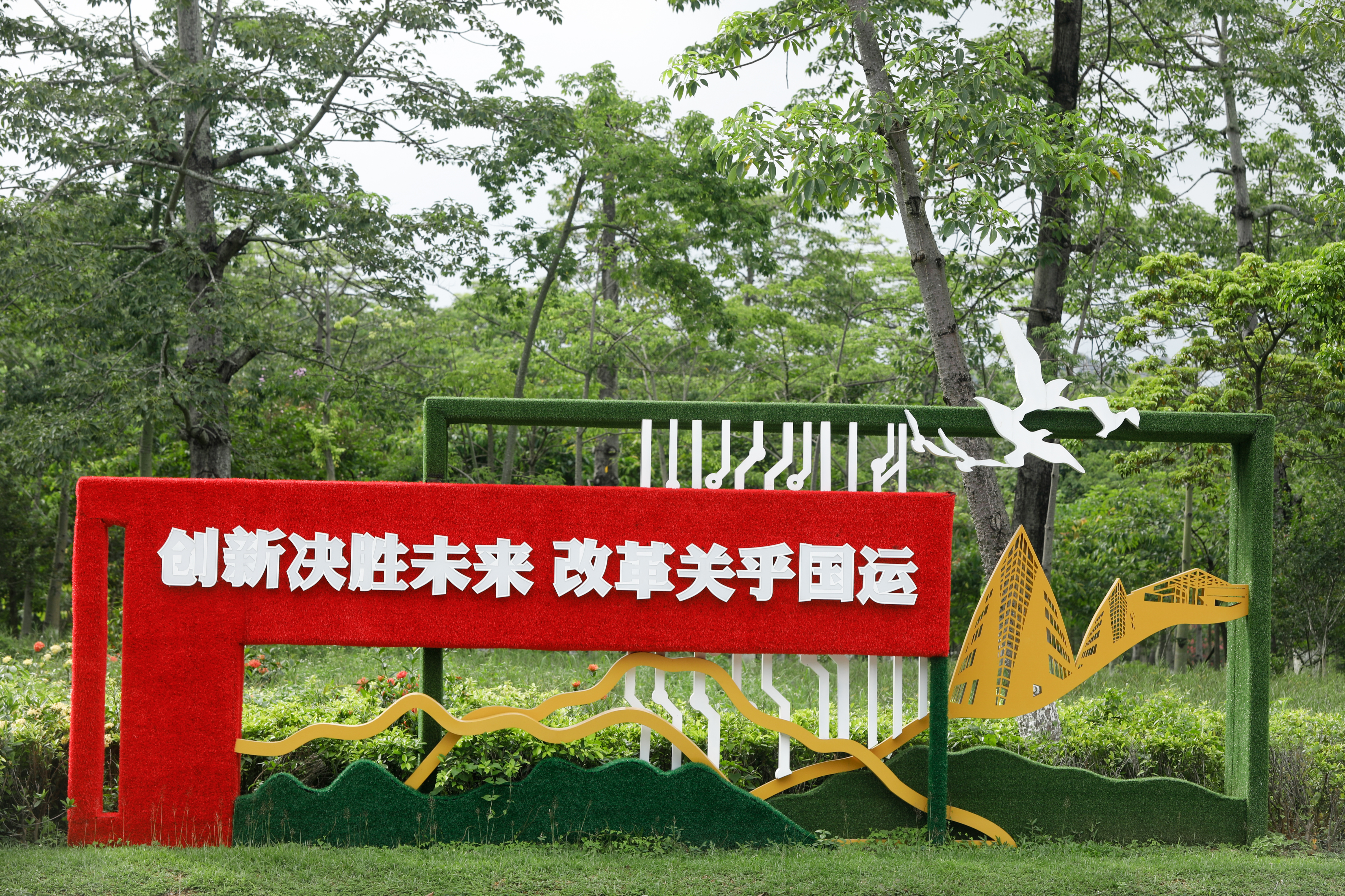 红棉路展示宣传标语——“创新决胜未来 改革关乎国运”。