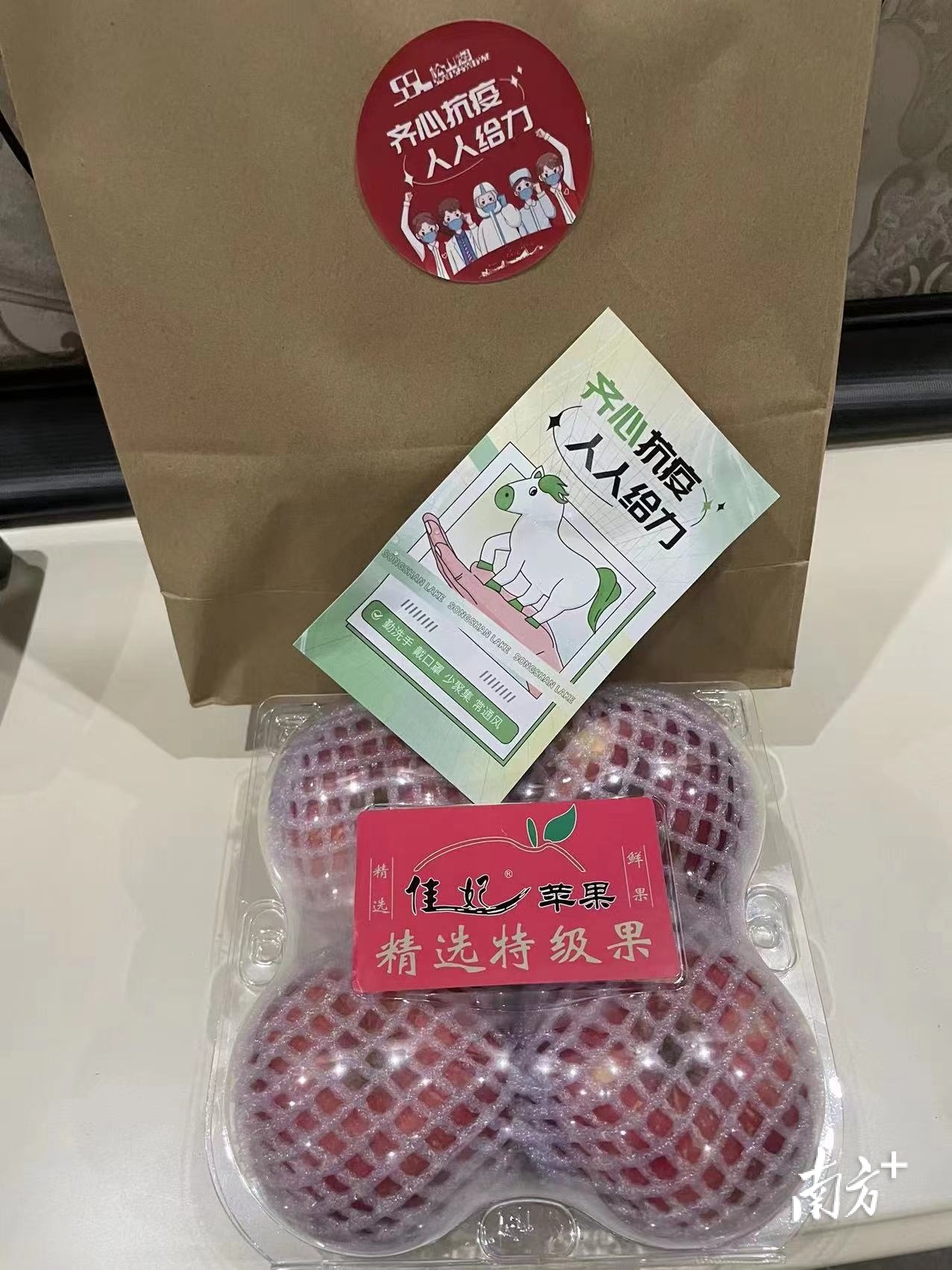 “感谢工作人员悄悄送来的平平安安!”7日18日晚,松山湖光大二期山河语岸小区居民发现家门口多了一份物资袋,里面装有一份苹果和“绿马”小卡片等物品。