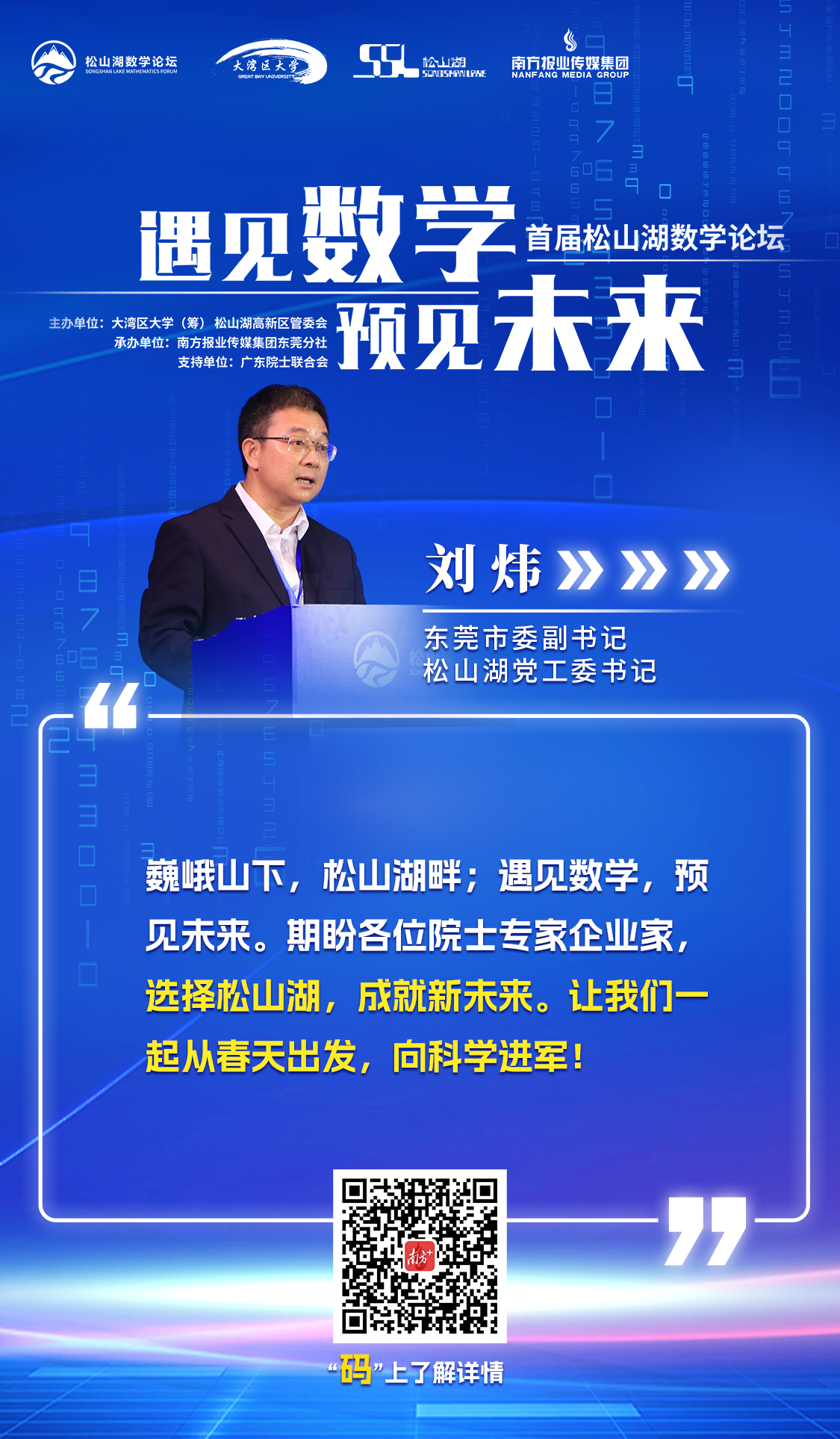 当日,主办方相关负责人向广大院士、专家、企业家发出诚挚邀约,期盼与大湾区大学等高校以及院士专家们一起,将论坛打造成长期且独具特色、国内顶尖的高端学术品牌,为我国乃至国际数学科学研究、数学普及应用和数学优秀人才的培养贡献力量。