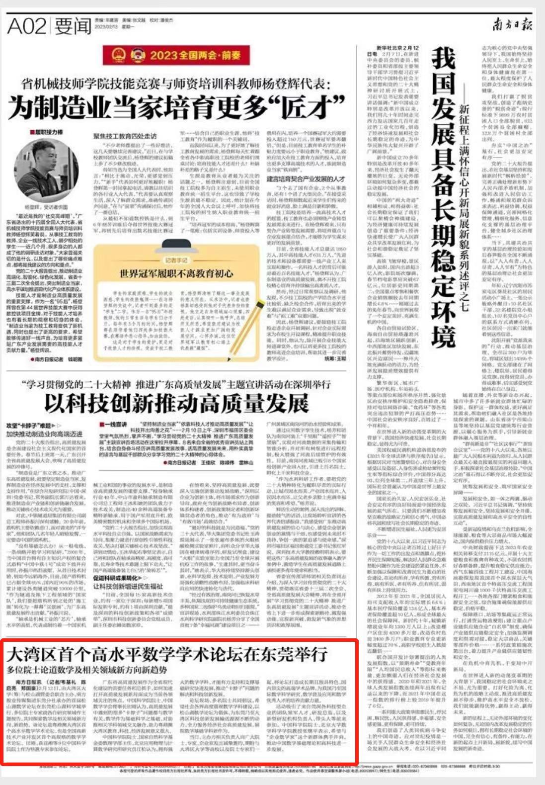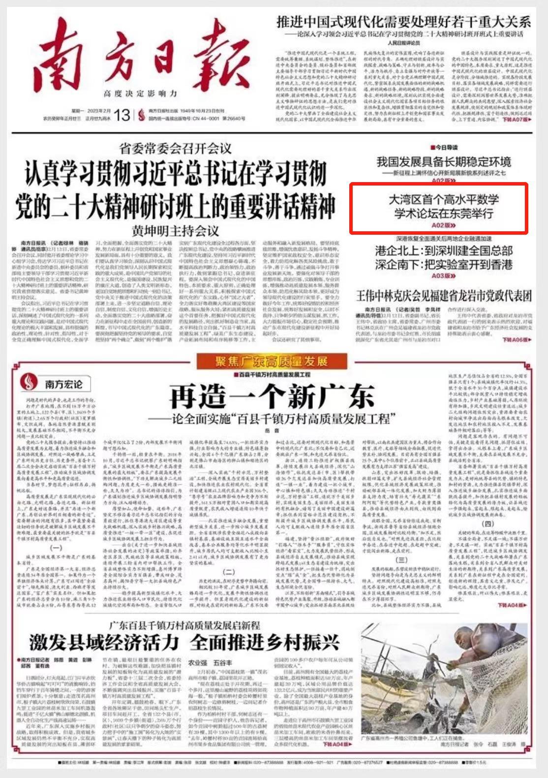 2月12日,由大湾区大学(筹)与松山湖管委会联合主办、南方报业传媒集团东莞分社承办的首届松山湖数学论坛在东莞松山湖科学城举行,多位院士专家就各自研究领域作主题报告,共同探索数学及相关领域新方向、新趋势。该论坛是粤港澳大湾区首个高水平数学学术论坛,也是全国高新技术产业开发区首个高规格的数学学术论坛。田刚、袁亚湘等9位中国科学院院士作为特邀专家参加论坛。