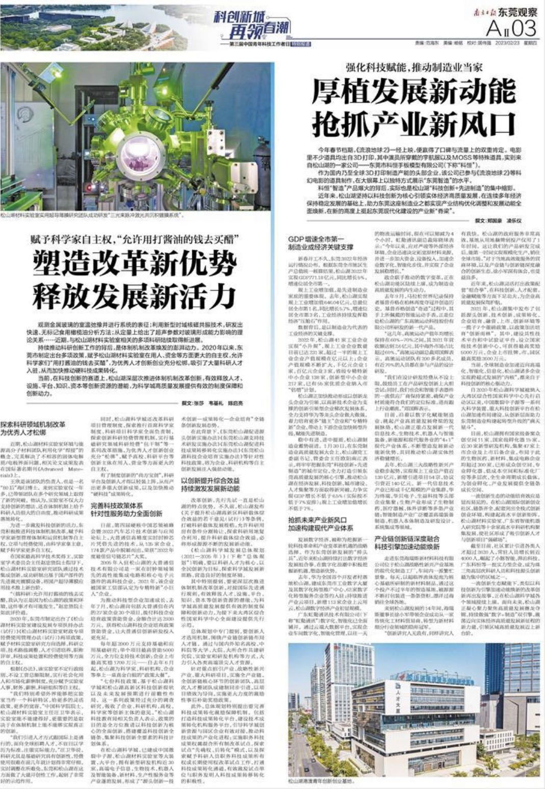 在此背景下,《东莞松山湖促进源头创新实施办法》《东莞松山湖支持技术研发实施办法》《东莞松山湖促进科技成果转移转化实施办法》《东莞松山湖科技企业培育实施办法》等针对性科技政策,将为企业、科研机构等自主创新发展注入强劲动能。