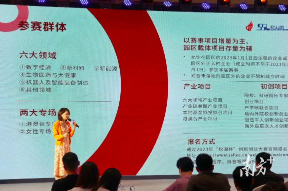 松山湖科技教育局金融科相关负责人对大赛的赛事流程、机制、奖励等情况进行整体介绍。她表示,本届“松湖杯”创新创业大赛将更加关注落地项目的未来成长,在赛程上创新设置了“赛后两年跟踪服务期”,奖励上设置了参赛项目奖、政策补贴、增值服务等一系列“大礼包”,为优秀项目提供全周期落地转化服务。